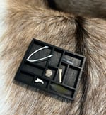 Inspired by Tracy Farr’s award winning novel ‘Wonderland’, in which the triplets (Oona, Hanna and Ada) kept a collection of precious things like ‘The Lost Finger Bone of Carnival Charlie Loverock’, these Reliquary collection pieces are made of tiny items that I’ve saved while working on pieces of taxidermy in the studio. Some have obvious connections, while others seem more eclectic at first glance.